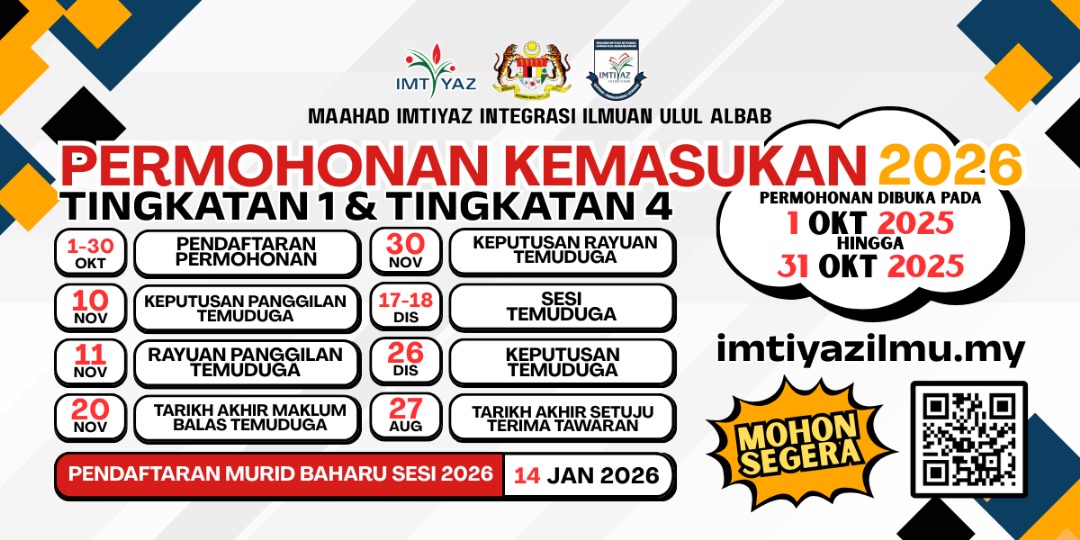 Untuk maklumat lanjut, sila hubungi pihak Maahad Imtiyaz. Kami menghargai perhatian dan kerjasama Tuan/Puan.